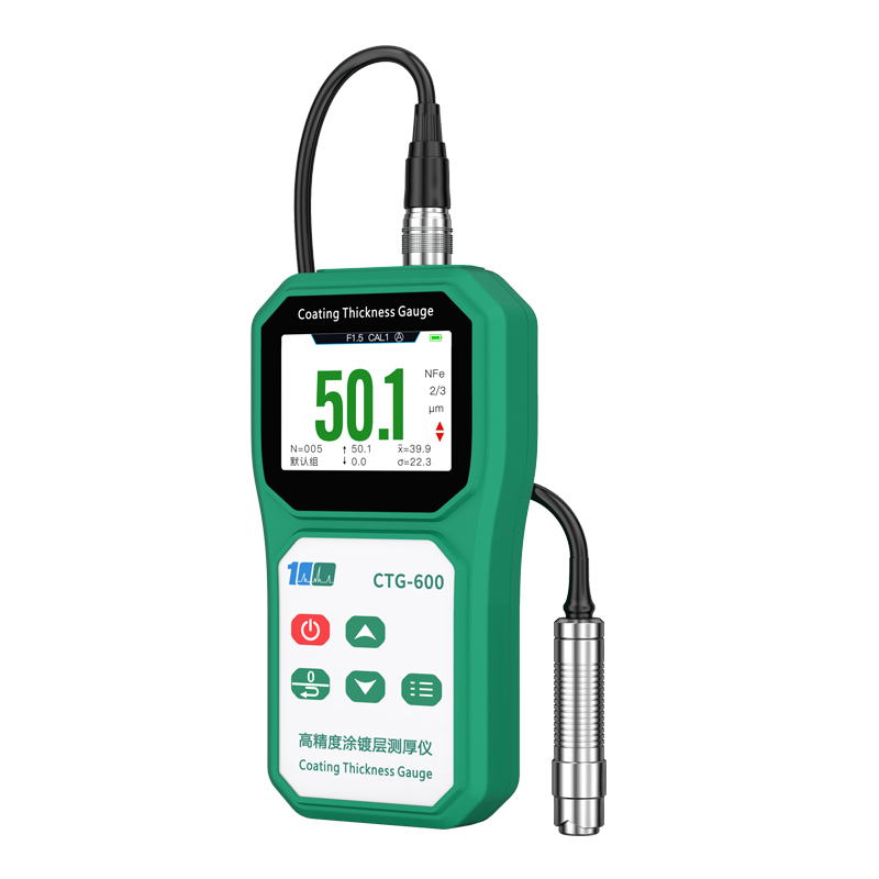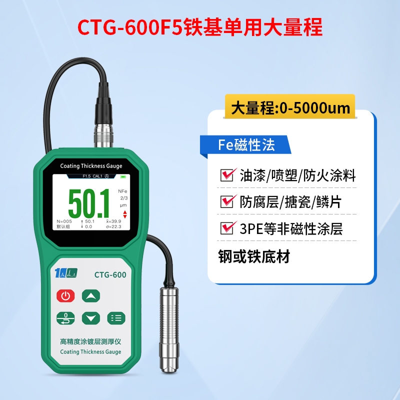 溢佰CTG-600F5分体式涂层测厚仪具有大屏幕彩屏显示、数据统计、单点和多点校准等功能,并且本产品耐高低温,抗摔,探头耐磨(50万次以上),测试稳定性好,测试速度快,适用于各种测量环境。其技术参数完全符合国家标准和国际标准。