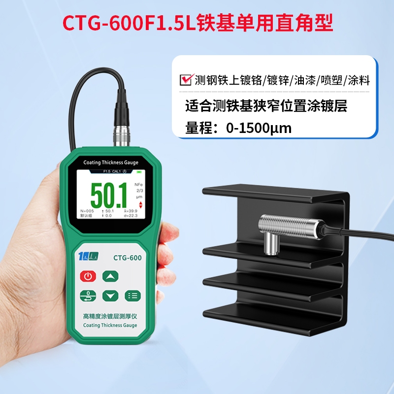 溢佰F1.5L直角探头可检测所有磁性基体上的非磁性涂层厚度,可以检测狭小位置区域,例如涂在钢、铁上的漆、粉末涂层、塑料、瓷、铬、铜、锌等。