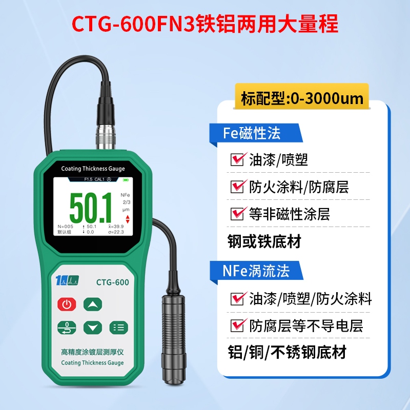 溢佰CTG-600FN3分体式涂层测厚仪具有大屏幕彩屏显示、数据统计、单点和多点校准等功能,并且本产品耐高低温,抗摔,探头耐磨(50万次以上),测试稳定性好,测试速度快,适用于各种测量环境。其技术参数完全符合国家标准和国际标准。