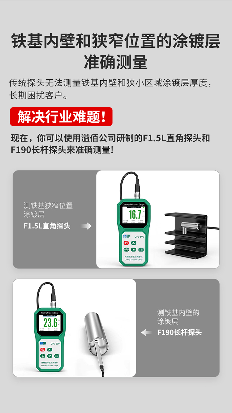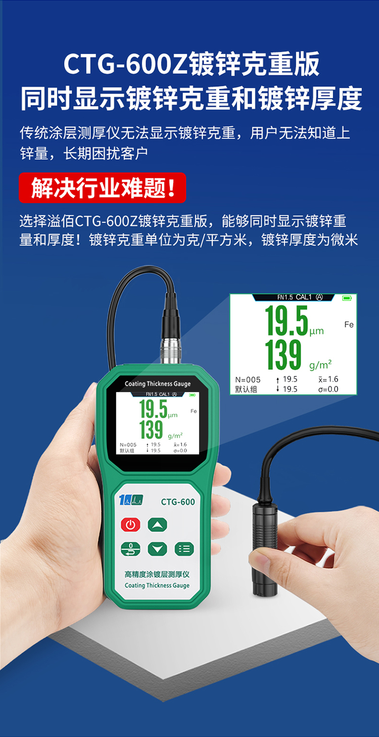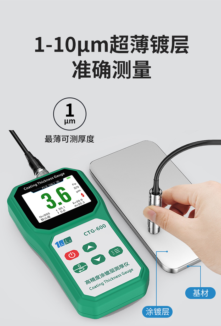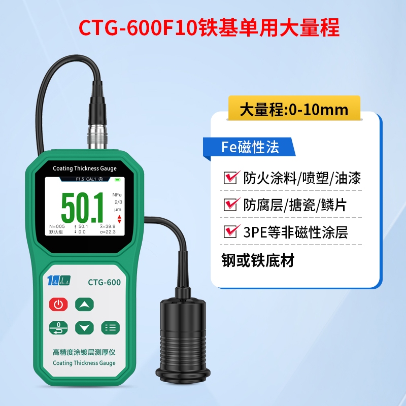 溢佰CTG-600F10涂层测厚仪具有背光、大屏幕数字显示、单点和多点校准等功能,并且本产品耐高低温,抗摔,探头耐磨(50万次以上),测试稳定性好,测试速度快,适用于各种测量环境。其技术参数完全符合国家标准和国际标准。