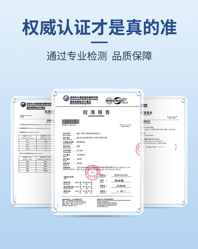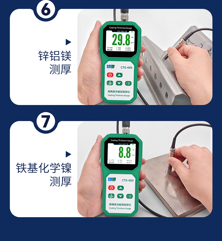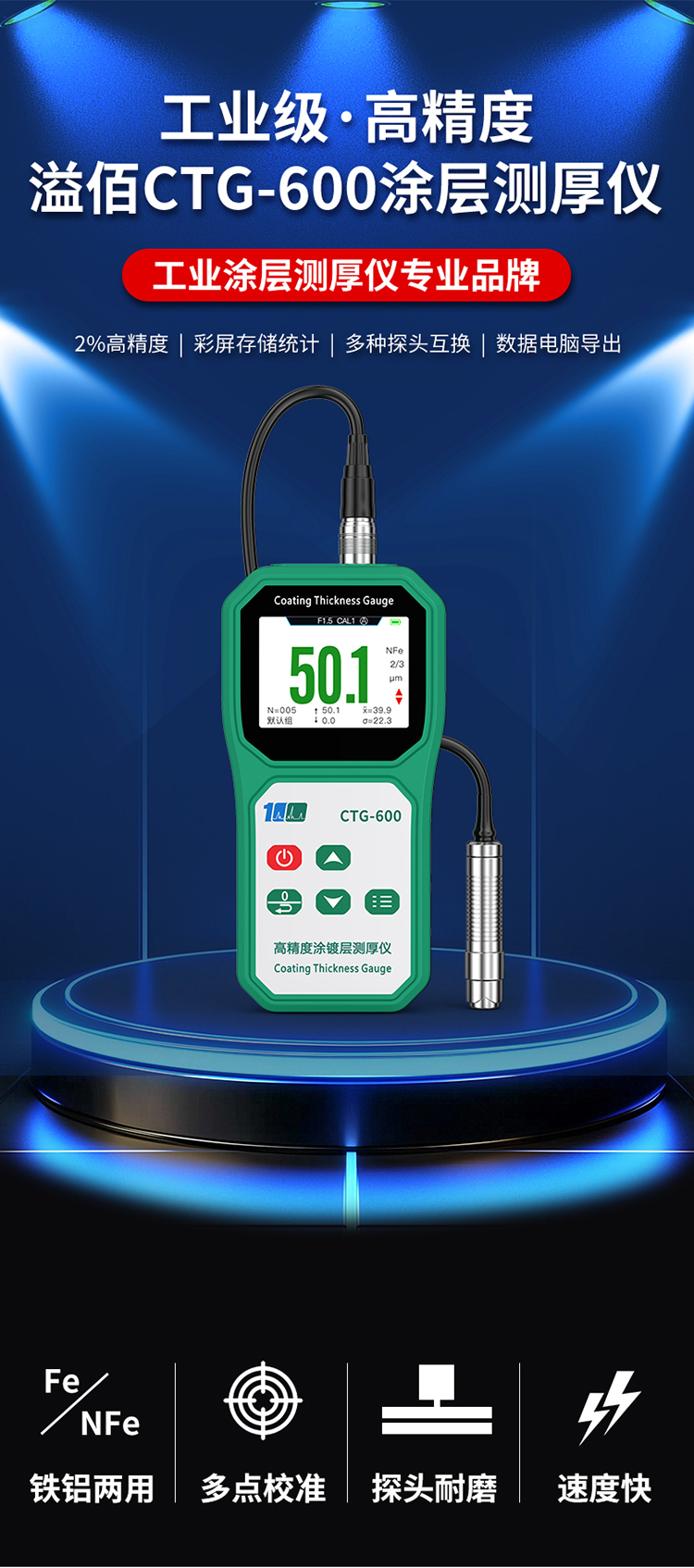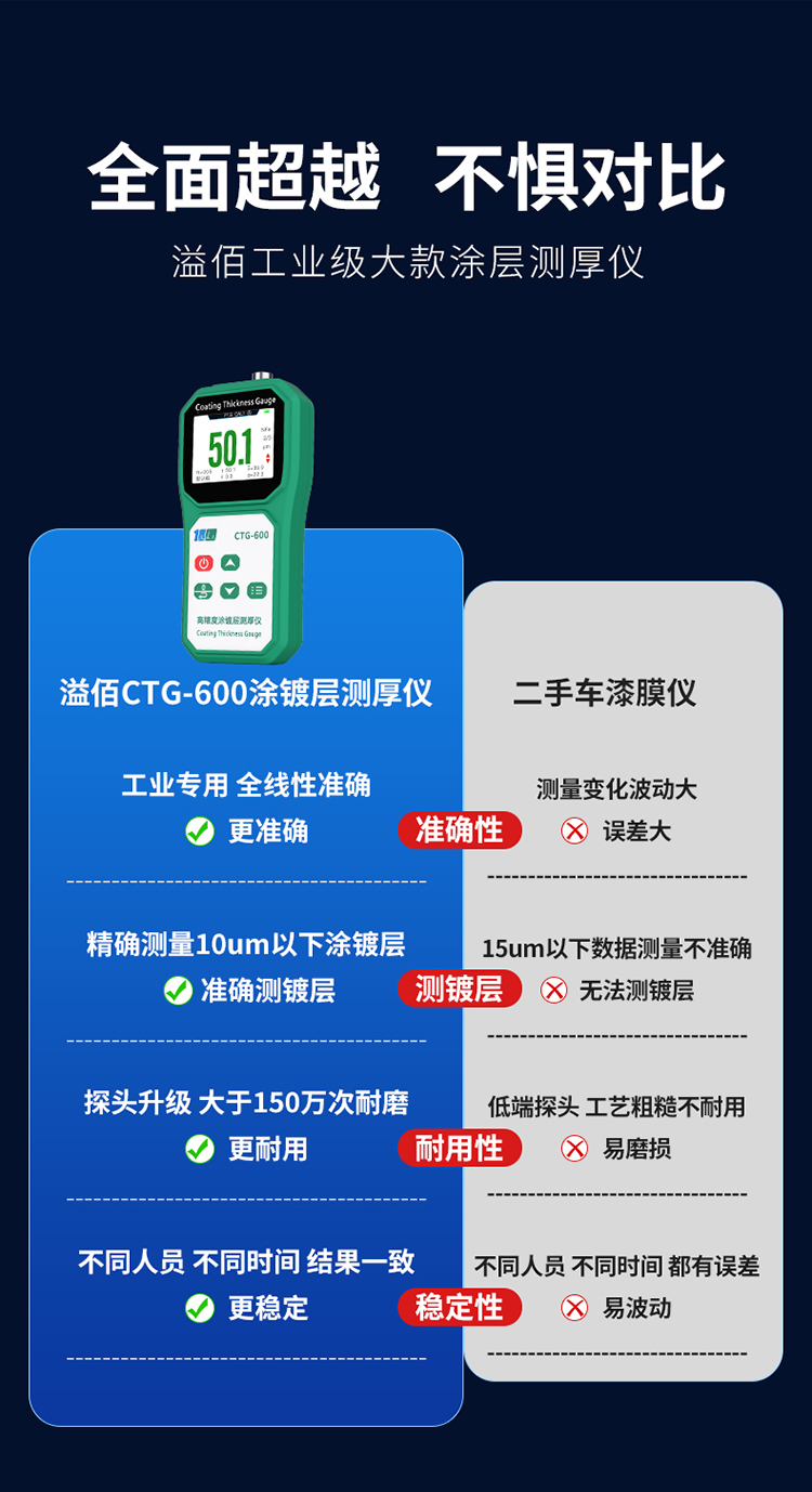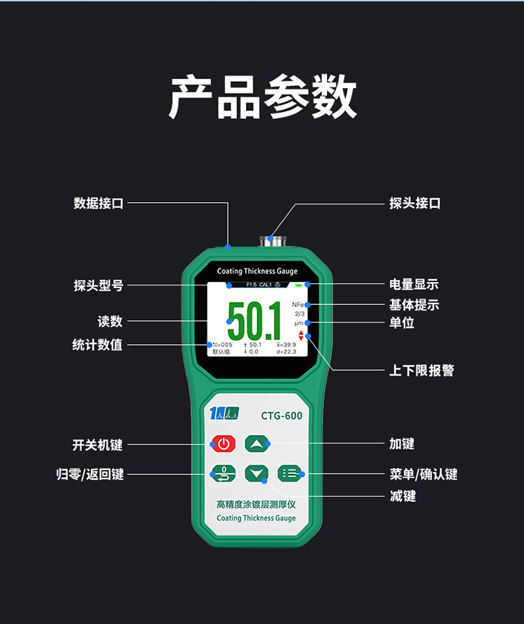 溢佰CTG-600F10涂层测厚仪具有背光、大屏幕数字显示、单点和多点校准等功能,并且本产品耐高低温,抗摔,探头耐磨(50万次以上),测试稳定性好,测试速度快,适用于各种测量环境。其技术参数完全符合国家标准和国际标准。