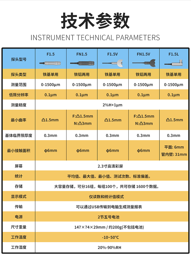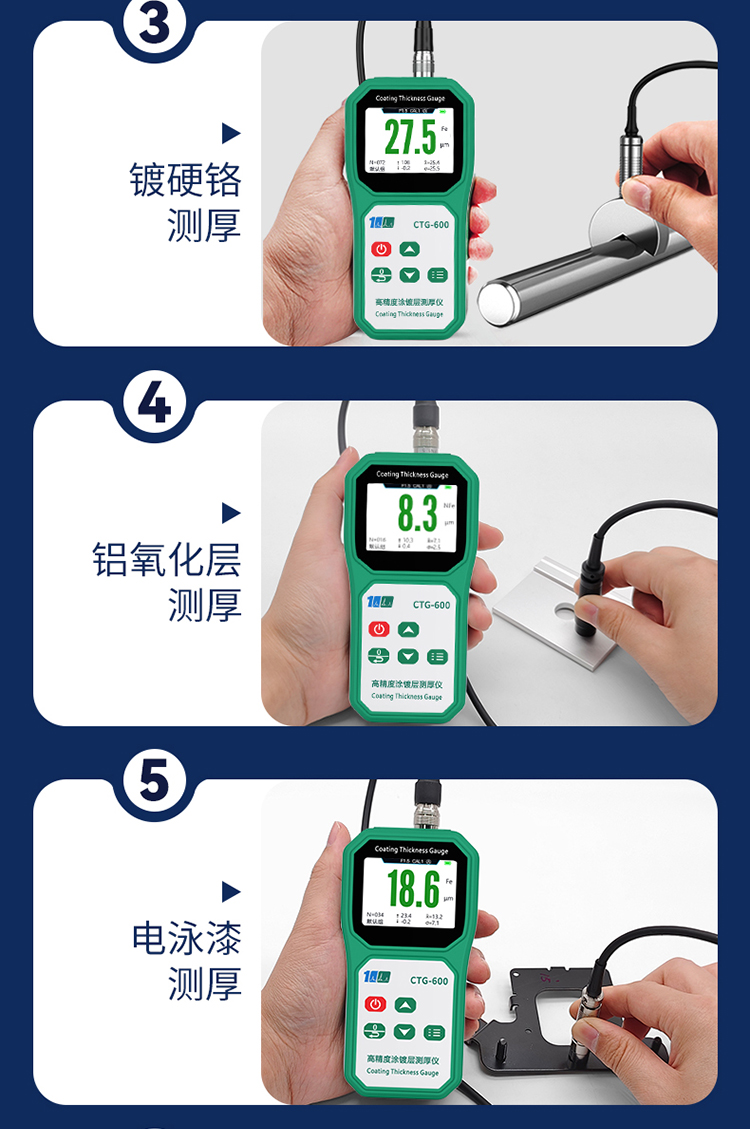 测量钢或者铁上的防火涂料、防腐层、搪瓷、鳞片、3PE等。