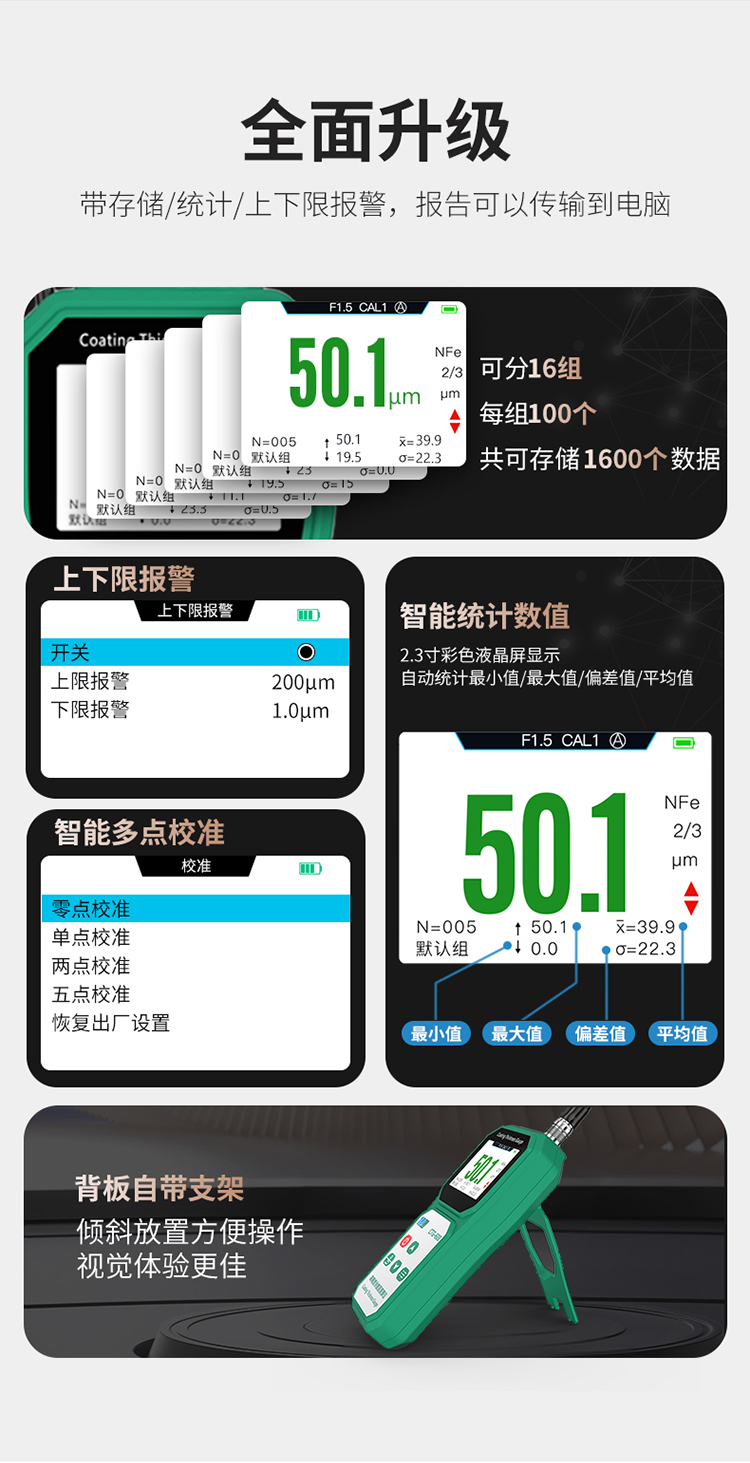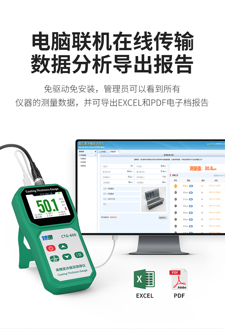 连接电脑:可连接USB 电脑软件生成测量报表,便于公司数据管理。